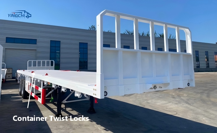 2 axle flatbed trailer with front wall can be fixed with various methods, such as: container twist locks or rope tighteners to suit different cargo. Yingchi offers the best transport solutions for you.