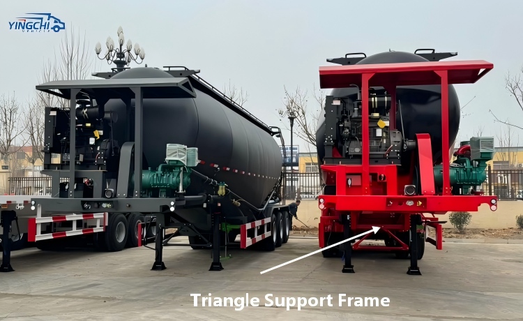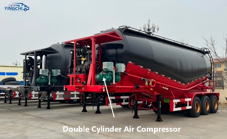 The working principle of this trailer is that the power provided by the diesel engine is transmitted to the air compressor through the device, and the compressed air enters the tank to liquefy the powder material. Due to the pressure difference, cement and other materials are transported along the unloading pipeline, and the fluidization phenomenon is to use the material characteristics to achieve cargo unloading.