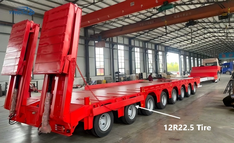 This 8 axle heavy duty 120t stepped trailer for sale is usually used to transport large engineering machinery and heavy construction equipment, such as: excavators, road rollers, loaders, cranes, etc. It has 5 high-performance load-bearing axles, which allows the trailer to have a maximum payload of up to 120 tons.